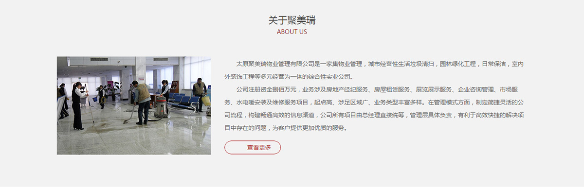 太原聚美瑞物業(yè)管理有限公司是一家集物業(yè)管理,城市經(jīng)營(yíng)性生活垃圾清掃,園林綠化工程,日常保潔,室內(nèi)外裝飾工程等多元經(jīng)營(yíng)為一體的綜合性實(shí)業(yè)公司。