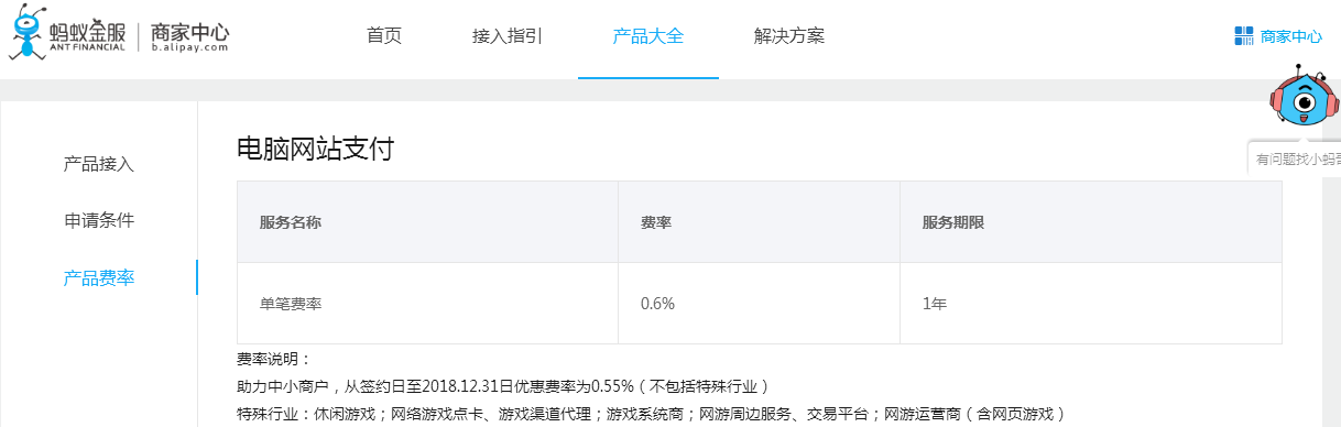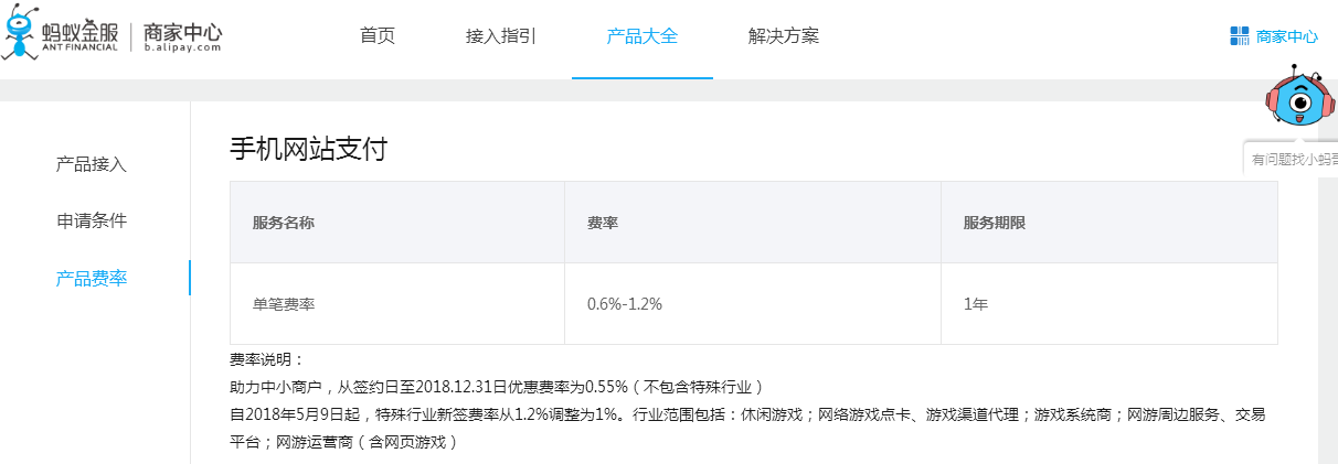 支付寶產(chǎn)品大全(https://b.alipay.com/signing/productSet.htm?navKey=all)中選擇各個(gè)產(chǎn)品,都能看到當(dāng)前產(chǎn)品費(fèi)率信息