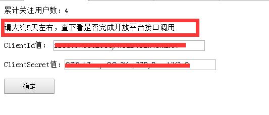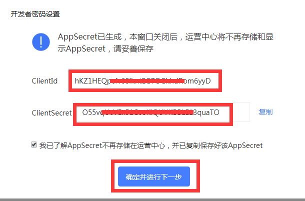 3、記錄:ClientId和ClientSecret后面的值,點(diǎn)擊確認(rèn)并進(jìn)行下一步按鈕如圖: